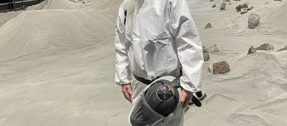 Hinter ihm wölben sich 950 Tonnen fein gemahlenes weiß-graues Gestein aus der Vulkaneifel zu einem Tal und größeren Hügeln, alles sauber glattgezogen. Verteilt sind spitze Steine unterschiedlicher Größe. Die Brocken stammen aus dem Nördlinger Ries, vom Ätna und von den Lofoten. Betreten der Oberfläche ist streng verboten. Jeder Schritt könnte feinsten Staub meterhoch aufwirbeln. Alle Besucher müssen Schutzmasken tragen, dazu kommen Haarnetze und spezielle Schuhüberzüge, um nichts auf den Mond zu bringen, das dort nicht hingehört. Grassamen zum Beispiel.