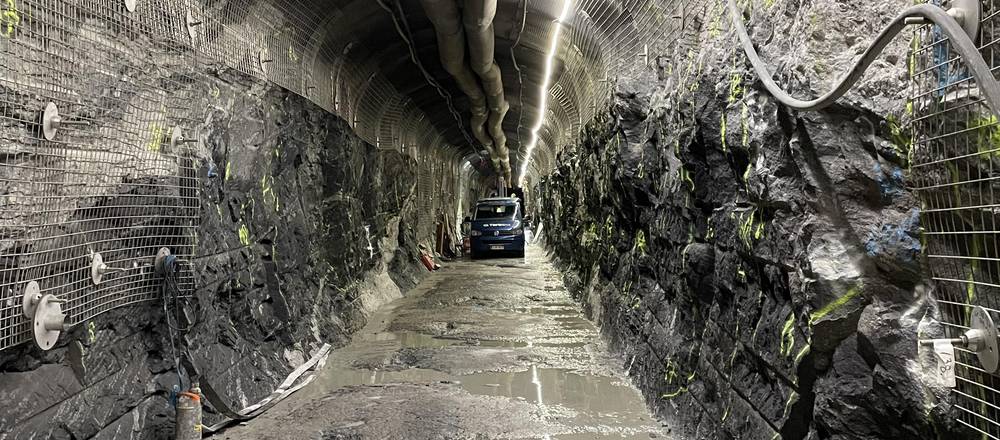 Es ist trocken hier unten, bei dauerhaft elf Grad. Obwohl die Lüftung brummt, riecht es leicht nach Abgasen der schweren Maschinen. Während die Wände der Haupttunnel mit Stahlnetz und grauem Beton verkleidet sind, tritt hier im Seitentunnel das rohe Gestein hervor, 1,9 Millionen Jahre alt. Am Boden sind im Licht der Leuchtstoffröhren etwa alle acht Meter grüne Kreuze zu sehen. Jedes markiert die Stelle für ein Loch, in dem vermutlich 2025 ein Behälter mit Atommüll versenkt wird. Denn was wie ein Bergwerk aussieht, ist das bisher einzige Endlager der Welt: Onkalo.