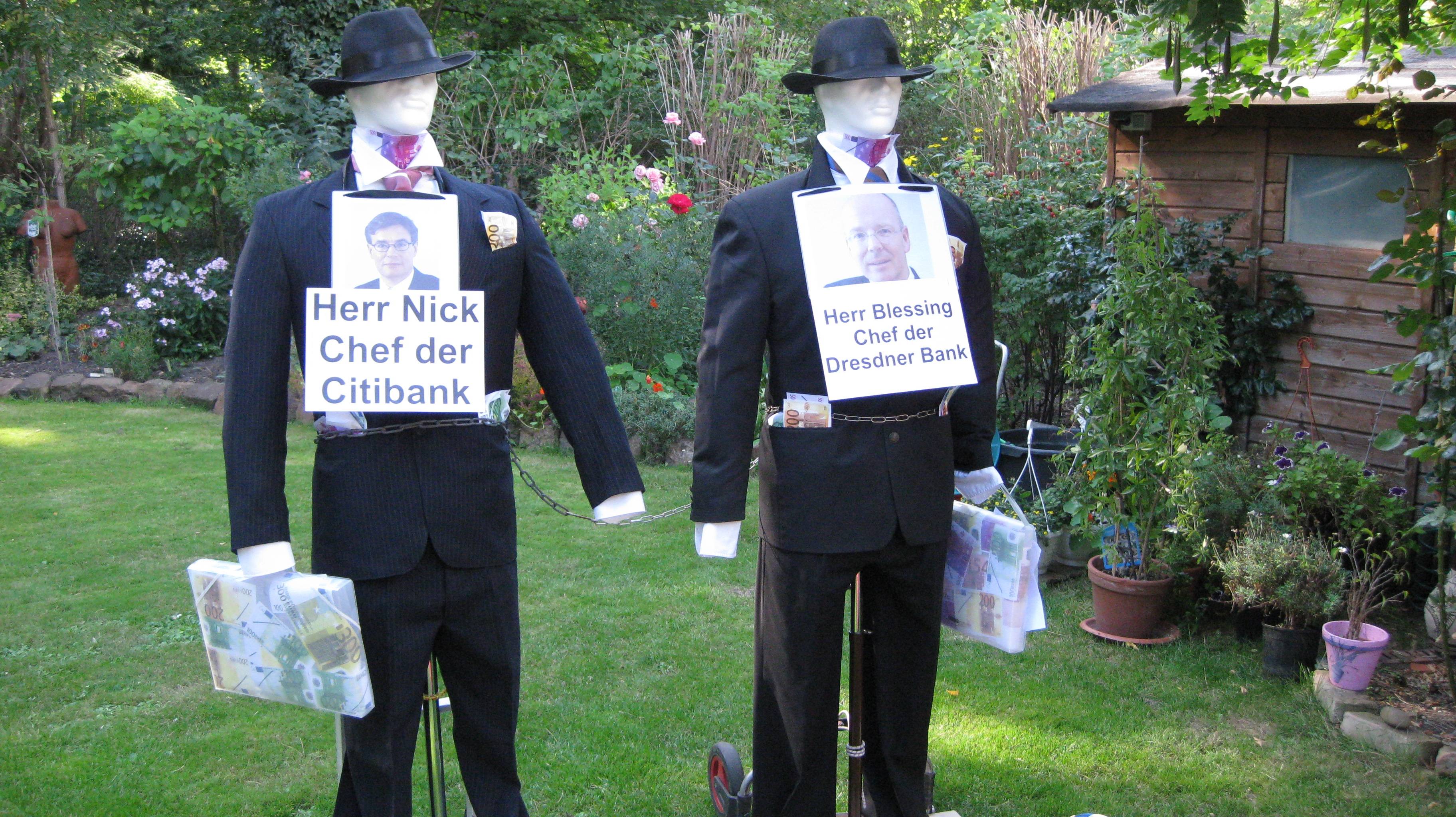 Der adrette Garten im Berliner Nobelquartier Schlachtensee dient als Bühne für die Generalprobe eines traurigen Stückes. Zwischen Blumenrabatten und kurz geschorenem Rasen geben zwei lebensgroße Puppen und schwarzen Anzügen, mit gefüllten Geldkoffern in der Hand, die Staffage ab. Sie stellen die Chefs der Dresdner Bank und der Citibank dar, wenn an diesem Dienstag vor den Filialen beider Institute die Premiere stattfindet. In einem Theaterstück spielen geschädigte Kleinanleger die tragische Geschichte ihrer Verluste nach, die bei allen ähnlich klingt und sich um Verluste mit Zertifikaten der US-Bank Lehman Brothers dreht. Bundesweit finden heute ähnliche Aktionen statt.