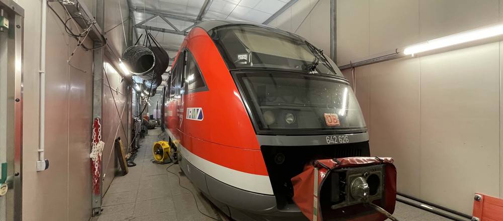 Was für ein Sommertag. Keine Wolke am Himmel, die Sonne brennt auf die hellgraue Halle in Minden, Westfalen. 30 Grad, T-Shirt-Wetter. Doch der Techniker, der gerade die Tür an der Seite öffnet, trägt wattierte Jacke und lange Hose. Denn im Innern des Gebäudes herrschen Temperaturen wie an einem kalten November-Morgen. Zehn Grad. Und mitten drin steht ein roter Zug der Baureihe 642, wie er auf vielen Strecken im deutschen Nahverkehr unterwegs ist.